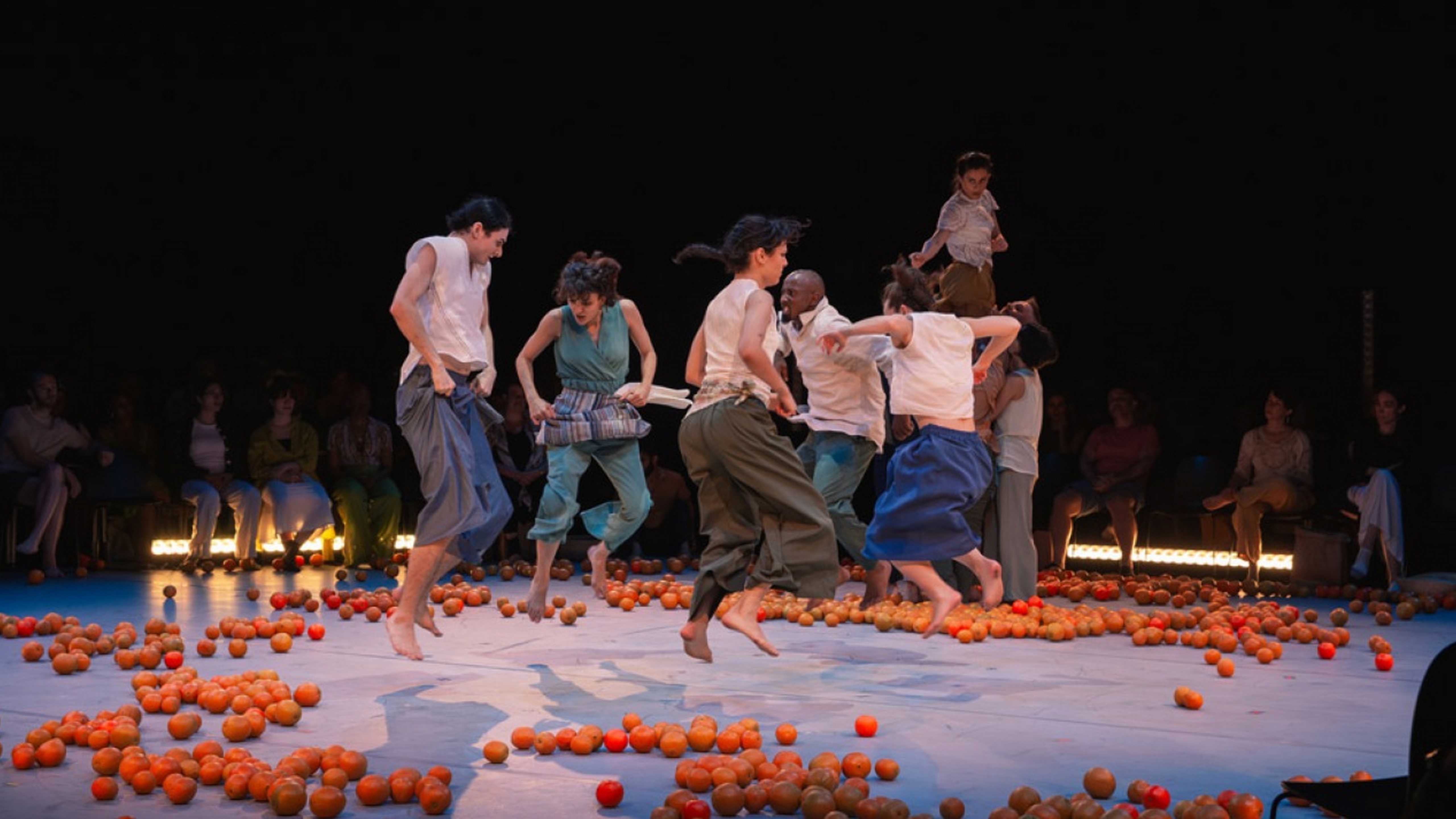 Sur scène, un paysage d’attente et d’espoir formé d’une montagne d’oranges. Les fruits – symboles de la Palestine – roulent, se dispersent. Treize artistes gravitent autour, jonglent avec, y disparaissent. Des fiançailles au crépuscule, de flashbacks en chorégraphies effervescentes, l’histoire d’une femme palestinienne se tisse et se défait. Ce Gathering, ce rassemblement, c’est « le sens de la communauté et la force de notre peuple » selon Samar Haddad King. Artiste touche-à-tout, palestino-américaine travaillant entre la Palestine et les États-Unis, elle fait le pari de la diversité des formes esthétiques, des corps et des origines. Accompagnée des Quatre saisons de Vivaldi revisitées par Max Richter, elle relie l’unisson de la danse folklorique au cirque et au chant pour créer une expérience participative puissante et solidaire.